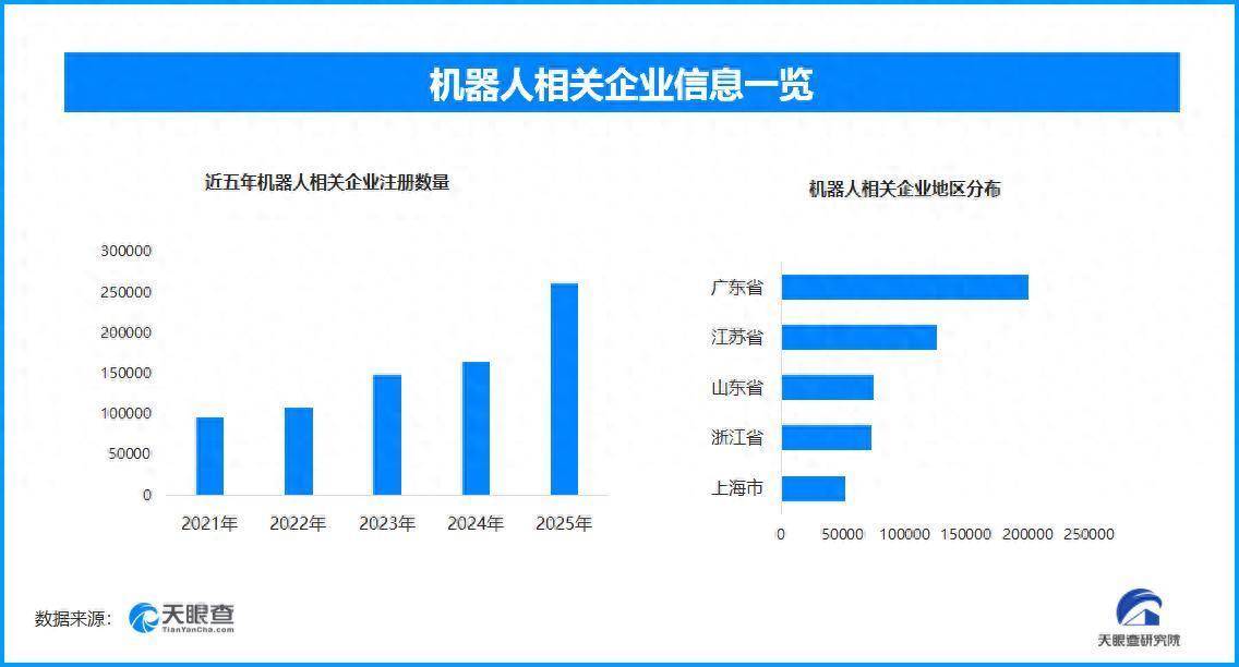天眼查专科版工商信息数据露馅,终端现在我国现有在业、存续气象的机器东说念主相干企业超105.8万家。其中,2025年新增注册相干企业超26.1万余家,从企业注册数目趋势来看,近五年间,机器东说念主相干企业的注册数目呈现出逐年增长的态势,并在2025年达到顶峰。