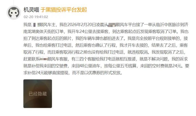 在盛大投诉中,无故取消订单导致乘客空等、顺风车车主白跑的情况不在少数。(图/黑猫投诉平台截图)