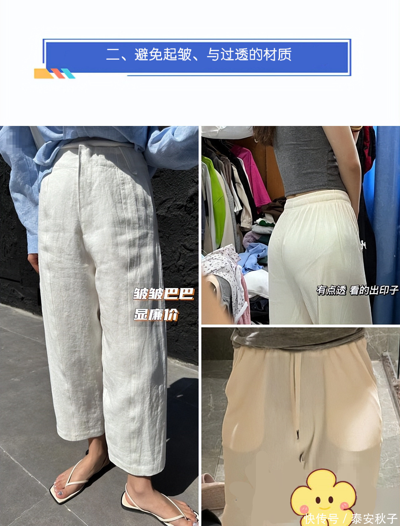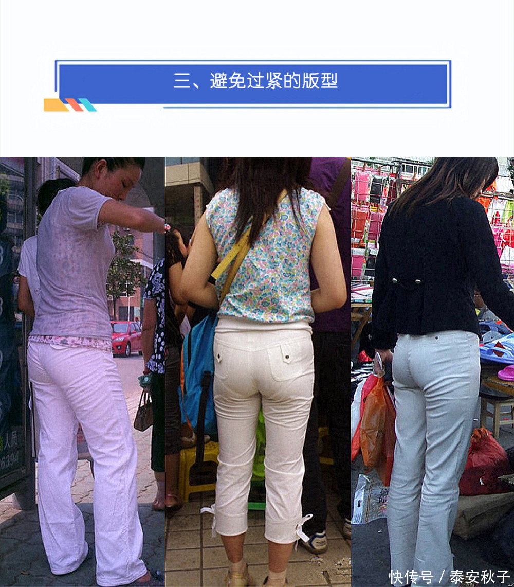 说完毕上衣的聘用,我们还要留心白裤子的材质:一定要避让容易起皱、或是透明材质。