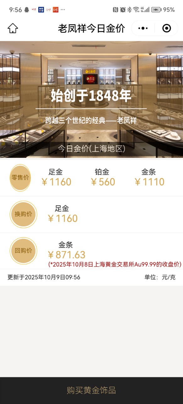10月9日,上游新闻记者查询发现,老凤祥足金饰品克价为1160元,较10月1日(1125元)高潮35元;周生生足金饰品克价为1170元,较10月1日(1130元)高潮40元;周大福足金(饰品、工艺品类)克价为1168元,较10月1日(1129元)高潮39元。