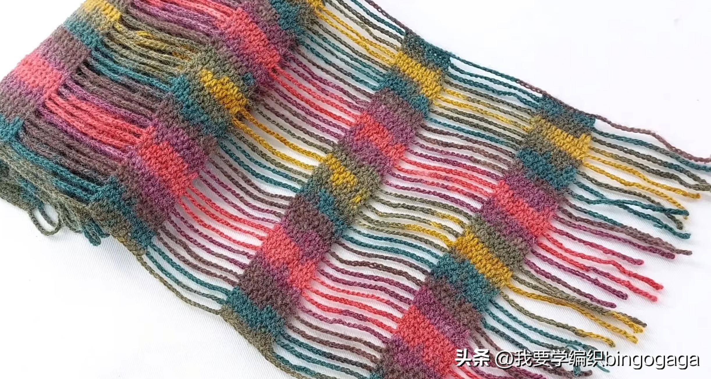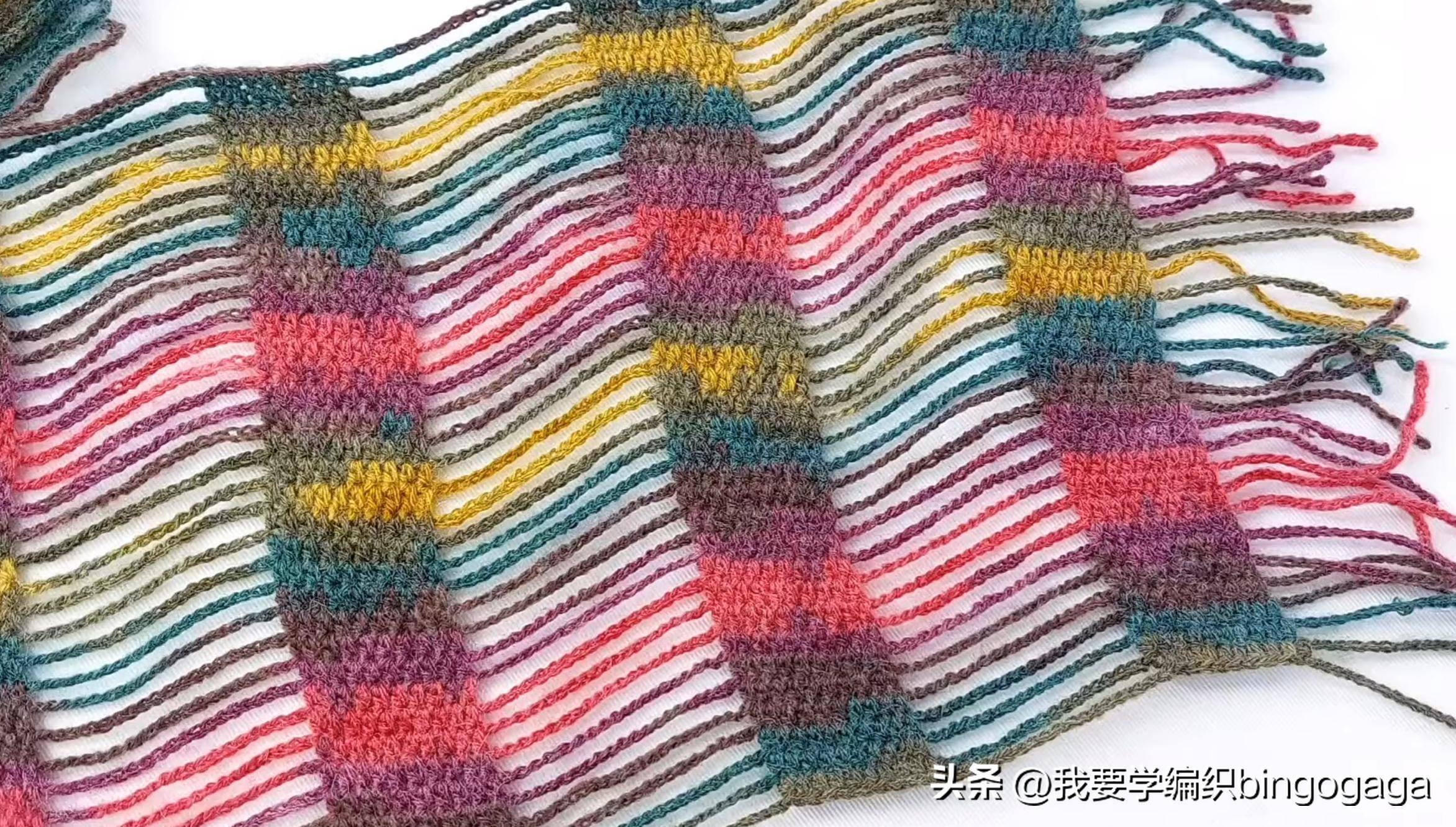 接着再另起线,按刚才那条通常的按序去钩(即锁针条对应锁针条,中长针上也曾钩中长针);后头就按照这么的按序,一直钩到思要的宽度,这么一款别出机杼的彩帘领巾就完成了。